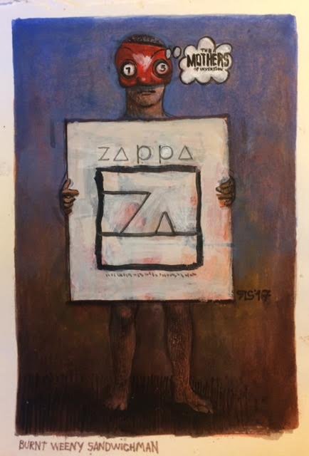 The piece on the right is entitled "Burnt Weeny Sandwichman". It's acryl on paper and measures about 12 on 18 cm.